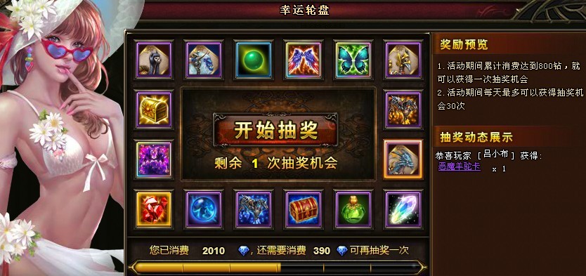 【活动内容】活动期间,玩家累计消费钻石800钻,即可抽奖一次,每日抽奖上限为30次。