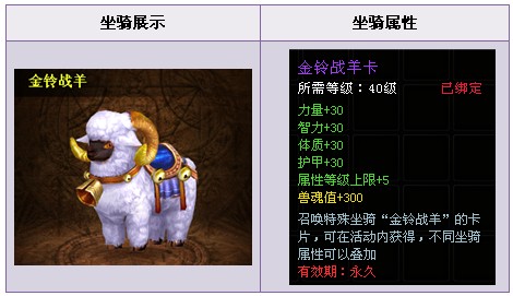 【活动内容】活动期间,商城出售超值“金铃战羊”坐骑,憨态可掬闪闪惹人爱。快来拥有一只豪杰专属的闪耀坐骑吧,让它载着你,上战场、下迷宫,破诸神,平天穹!