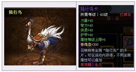 【活动内容】活动期间,商城出售超值“陆行鸟”坐骑,独特的外形,超高的属性加成,实至名归的勇士专属坐骑!