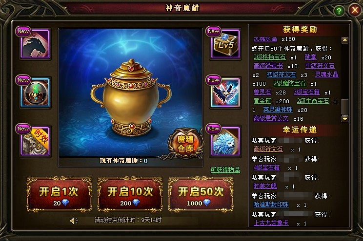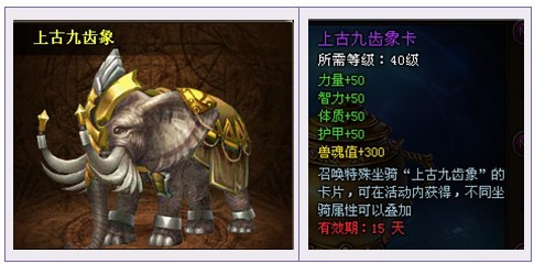 3. 温馨提示,本次魔罐的“上古九齿象”为限时坐骑,激活后有效时间为15天;