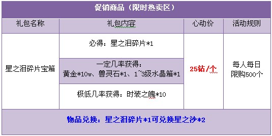 【活动描述】活动期间,商城限时热卖星之泪碎片宝箱,可开出稀有合成材料“星之泪碎片”!珍稀材料可遇不可求,众勇士寻觅之路艰苦卓绝。若珍宝现世,必千金以求!