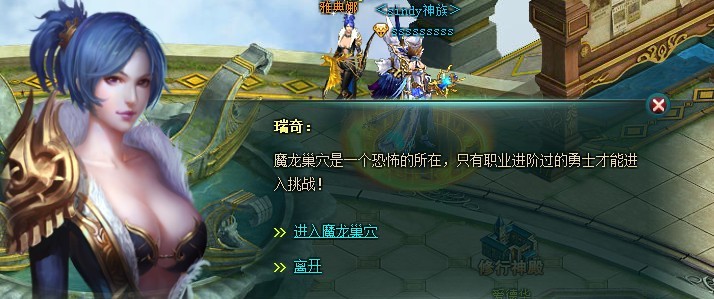 魔龙入侵为副本开放的多人的挑战boss模式,玩家通过天空之城NPC魔龙使者“瑞奇”进入,组队玩法,参与人数≤4人。进入场景时确定是否获取收益,不获取收益则不扣除体力。
