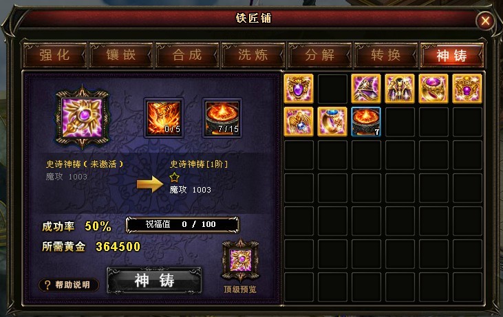 ? 铁匠铺增加新功能“神铸”,针对现有80级橙色装备开放史诗神铸,史诗神铸可激活装备额外的神铸属性