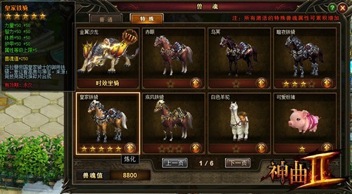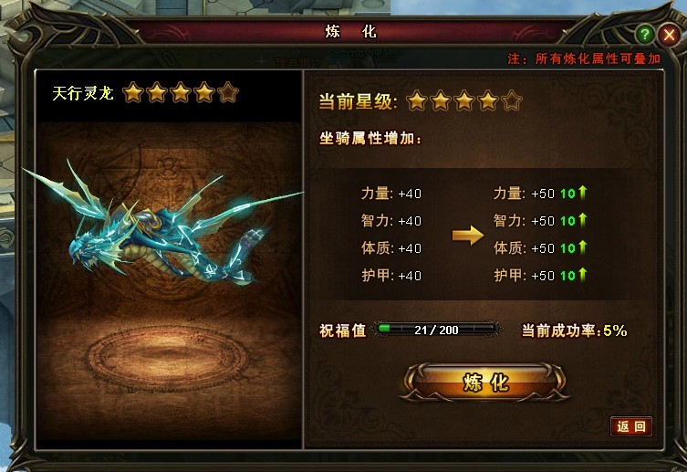 ? 每个激活的坐骑(除时效坐骑和VIP坐骑外)都可以炼化,每次进行炼化操作有几率立刻成功,星数+1,否则累加1次祝福值。祝福值蛮厚点击炼化100%成功,星数+1。