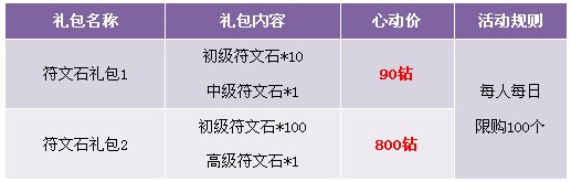 【活动内容】还在为符文等级过低烦恼吗?活动期间,商城上架符文石礼包,特大优惠回馈曲友。快来提升你的符文等级,将战力提升进行到底!