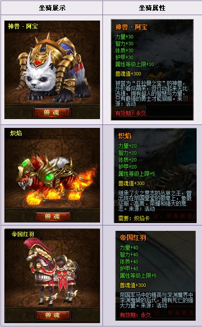 活动内容:活动期间,商城出售稀有坐骑,传说中的“神兽阿宝”、热情似火的“炽焰”、象征无上权利的“帝国红羽”年末特惠献礼啦!