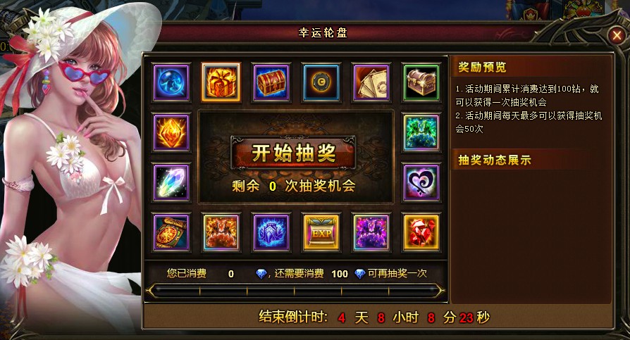 【活动内容】活动期间,消费轮盘开启,每消费100钻石可进幸运抽奖,每天限转50次。