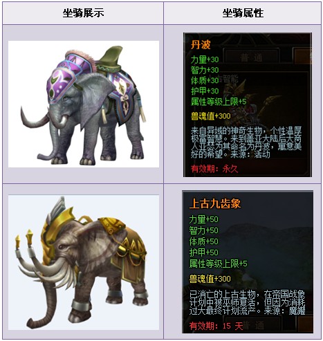 4、上古九齿象为失效坐骑卡,请留意使用时间。