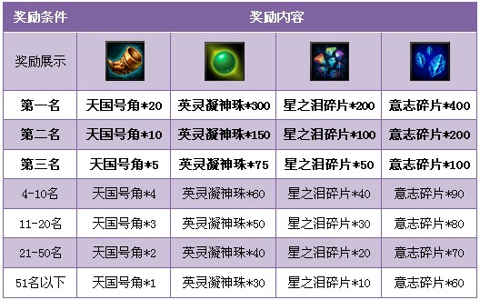 3. 幸运奖:特殊名次将会获得幸运奖,100w黄金、天国号角*2。