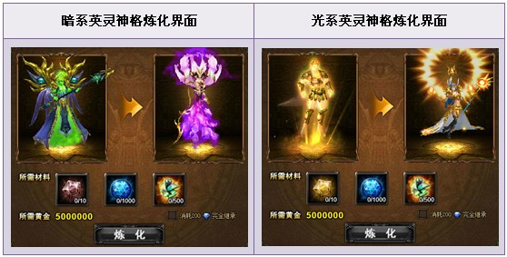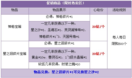 【活动内容】活动期间,商城限时热卖神格宝箱、星之泪碎片宝箱,可开出稀有炼化合成材料“神格碎片”、“星之泪碎片”。炼化你的光暗英灵,成就神级传说!