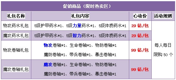 1. 礼包仅在商城“限时热卖”处出售;