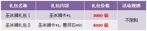 【活动内容】活动期间,商城出售“圣冰狮”坐骑。通透的冰蓝色在天空之城熠熠夺目,勇士的象征、猛将的伴侣,快来带回你的阵营!