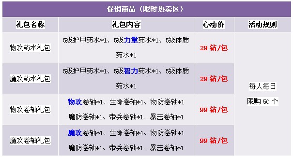 1. 优惠礼包在商城“限时热卖”出售,仅限使用钻石购买;