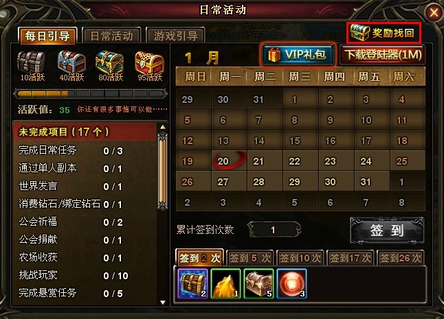 ? 玩家可在每日签到界面点击“奖励找回”按钮进入奖励找回界面;