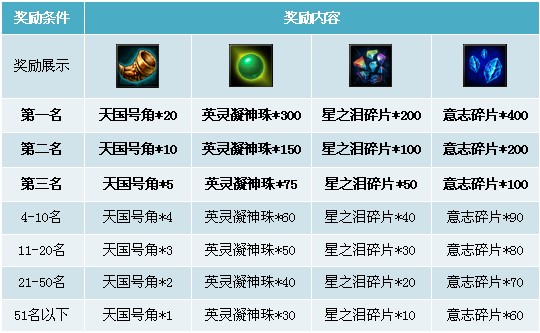 3. 幸运奖:特殊名次将会获得幸运奖,100w黄金、天国号角*2。