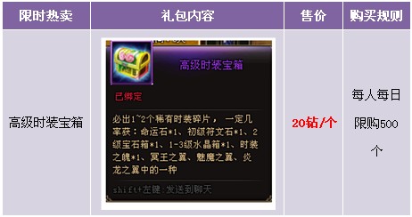 1. 购买高级时装宝箱、高级时装宝箱开出物品、活动兑换物品均为绑定;
