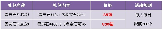 【活动内容】活动期间,商城特惠大礼包倾情酬宾,兽灵石搭配宝石箱限时热卖!