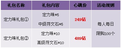 【活动内容】活动期间,商城上架定力珠礼包。高级命运守护,提升定力,稳如泰山。