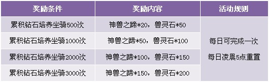 【活动内容】活动期间,累积使用钻石培养坐骑达到指定次数,即可活动相应奖励。孜孜以求神兽之蹄,念念不忘坐骑培养,活动一次满足你。