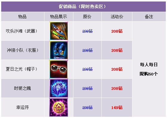 1. 礼包仅在商城“限时热卖”处出售,道具仅限“钻石”购买;