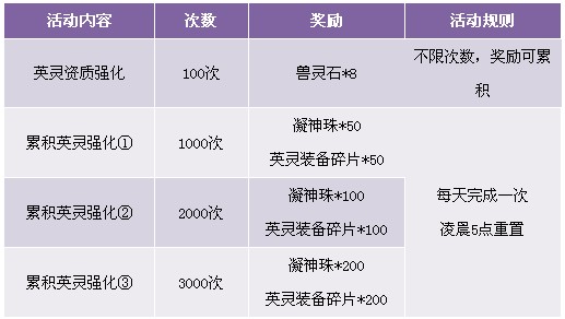 1.英灵资质培养100次活动,可重复参加。累积培养至1000次、2000次、3000次奖励每天领取一次;