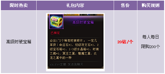 1. 购买高级时装宝箱、高级时装宝箱开出物品、活动兑换物品均为绑定;