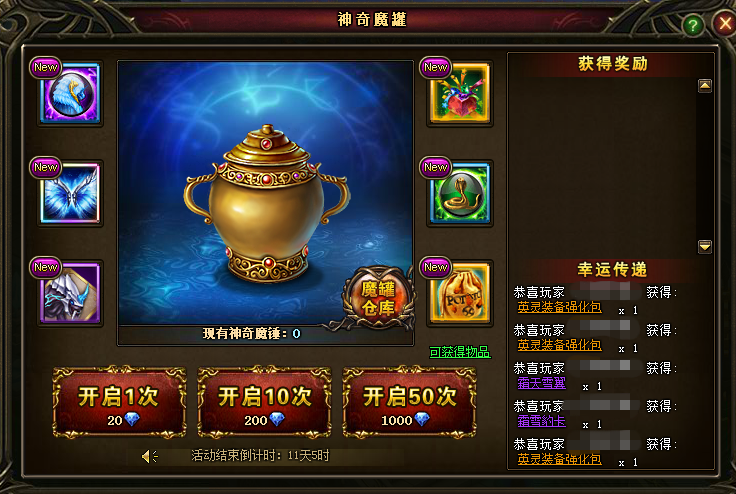 【活动内容】魔罐神秘降临,梦幻通透的珍稀翅膀霜天雪翼,空灵傲然于天空之城。新坐骑霜雪豹,外形奇幻,物种稀缺,魔罐首次亮相。神光笼罩的天空之城焕然一新,英灵的道路更深远,舞台更广阔,同时被赋予更强大的力量,英灵装备应运而生。魔罐特别推出英灵装备碎片包(碎片*10),英灵装备强化包,各种珍稀道具海格力斯封印珠(蓝色),美杜莎封印珠(蓝色),只要你开,即可拥有!