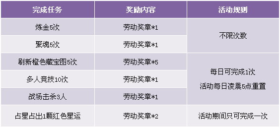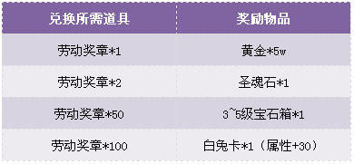 【活动内容】属于劳动人民的节日,神曲为所有辛勤的领主们贴心准备了收获的果实。节日期间,领主们炼金、聚魂、占星;和小伙伴们一起多人竞技;单枪匹马进入战场英勇杀敌等都可以获得特殊道具“劳动奖章”。而集齐指定数量的牌子可以兑换海量黄金、圣魂石、3-5级宝石箱,还可以得到可爱又呆萌的白兔坐骑卡哦。