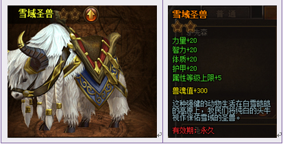 【活动内容】活动期间,一次性充值指定金额,即可获得超值大礼,超高返利爽翻天。来自雪域的圣兽,首次现身,10级生命宝石,再现光芒。