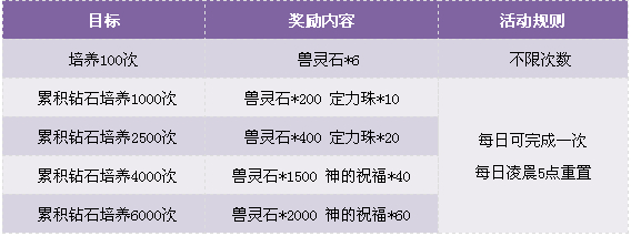 2. 累积培养坐骑至1000次、2500次、4000次、6000次奖励每天可参与并领取一次;