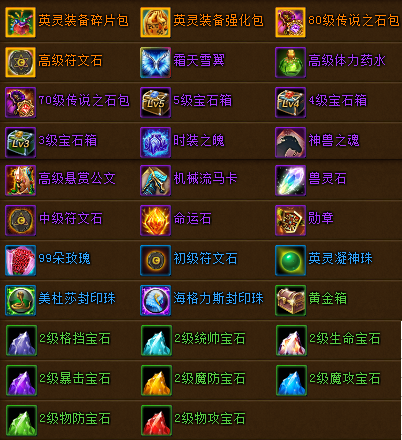 黄金10W 绑钻*50 兽灵石*10 | 黄金10W 绑钻*50 命运石*10 | 黄金10W 绑钻*50 中级符文石*10 | 黄金10W 绑钻*50 圣魂石*10 | 黄金10W 绑钻*50 凝神珠*10 |