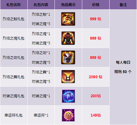 1. 礼包仅在商城“限时热卖”处出售,道具仅限“钻石”购买;