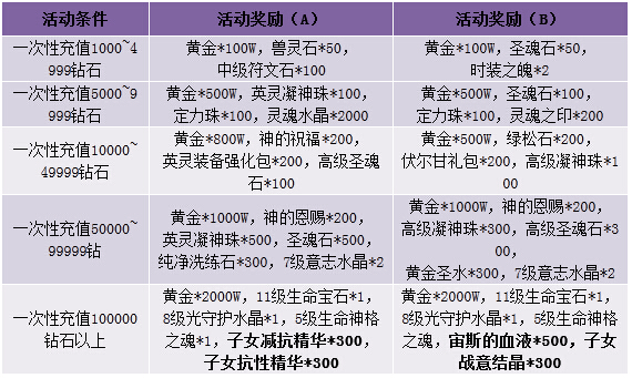 【活动内容】活动期间,一次性充值指定金额,即可获得超值大礼。高级凝神珠、高级圣魂石、高级宝石、守护水晶,各种珍贵道具,充值拿钻石得奖励。
