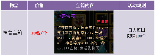 【活动内容】活动期间,商城上架神兽宝箱,18钻一个,收集一定数量的神兽碎片可以兑换各种稀有坐骑。