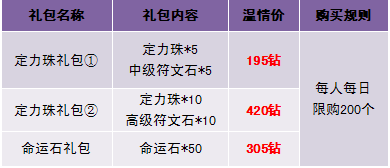 礼包名称 | 礼包内容 | 价格 | 活动规则 |
