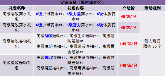 1. 优惠礼包在商城“限时热卖区”出售,限时热卖区域中的道具仅限“钻石”购买;