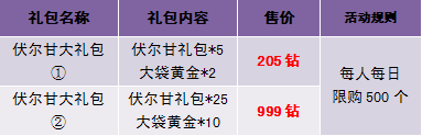 【活动内容】活动期间,伏尔甘礼包搭配大袋黄金特价出售,小伙伴们再也不用为神铸黄金不够发愁啦,赶快行动吧!