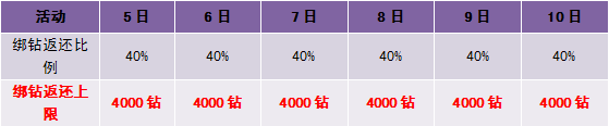 【活动内容】活动期间,玩家在当日消费的钻石按照一定比例返还玩家,返还的绑钻次日在游戏内领取。