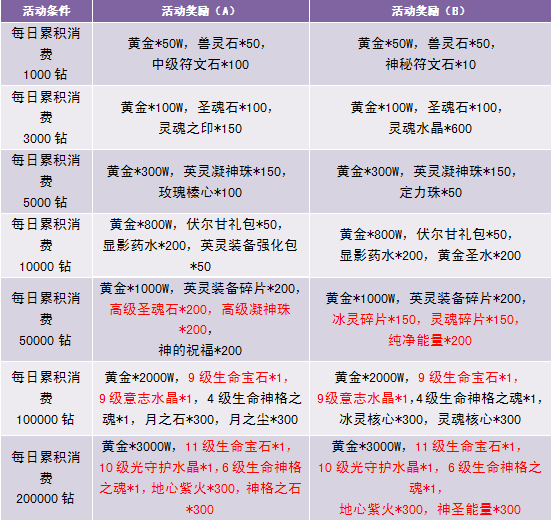 3. 活动期间累计消费满足条件可领取奖励,每重奖励玩家只能领取一次, 请留意领取活动奖励。