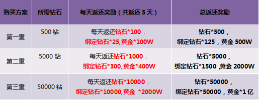 【活动内容】:号外!号外!钻石黄金大返利,活动期间,玩家参加钻石矿脉活动,百分百返还等价额的钻石,还可额外获赠绑定钻石和大量黄金喔!