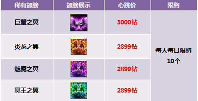 【活动内容】活动期间,商城上架特价稀有翅膀。天空之城车水马龙,茫茫人海中一抹低调的华丽,散发着幽暗的冥冥之光,仿佛不灭的地狱之火,好似燃烧的异域之焰。它们绝不是普通的翅膀,更是尊享荣贵的特殊符号。