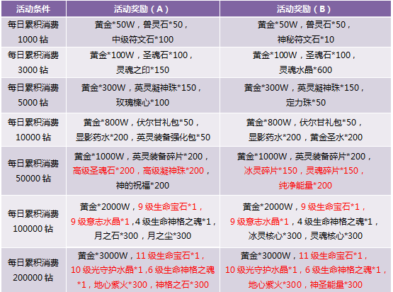 3. 活动期间累计消费满足条件可领取奖励,每重奖励玩家只能领取一次, 请留意领取活动奖励。