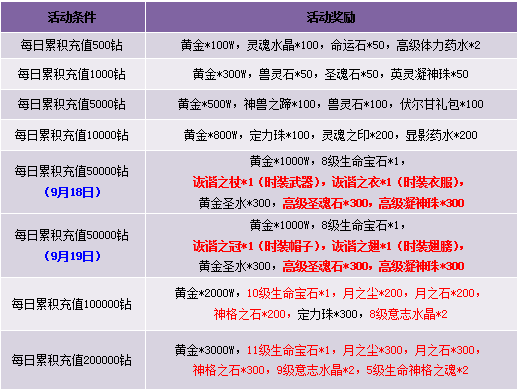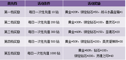 1. 每日首次充值10钻以上即可获得第一档奖励,领完本档奖励可充值参加下一档活动,第二次一次性充值200钻以上可以获得第二档奖励,以此类推,一次充值达到条件领取对应档礼包一份;