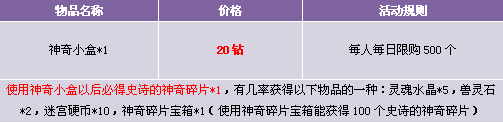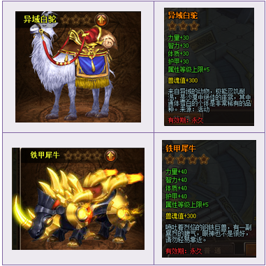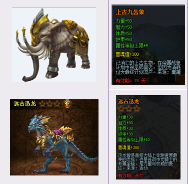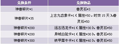 【活动内容】活动期间,商城上架神兽宝箱,18钻一个,收集一定数量的神兽碎片可以兑换各种稀有坐骑。