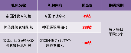 1. 优惠礼包在商城“限时热卖区”出售,限时热卖区域中的道具仅限“钻石”购买;