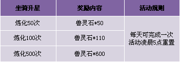 1. 钻石培养坐骑100次不限次数,累积培养坐骑至500次、1000次、2000次、3000次,每次可完成一次,活动次数每天凌晨5点重置,请留意领取奖励,奖励皆为绑定;
