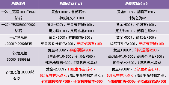 【活动内容】活动期间,一次性充值指定金额,即可获得超值大礼。高级凝神珠、高级圣魂石、高级宝石、守护水晶,各种珍贵子女道具,充值拿钻石得奖励。