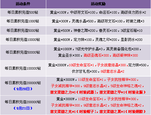 1. 每日累积充值达到1000钻石可同时获得累积充值1000和500档次的两重奖励,依此类推;