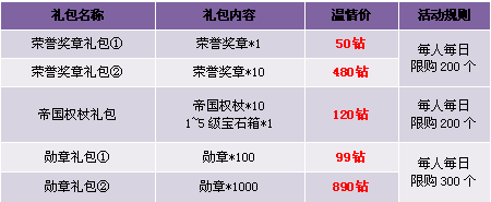 【活动内容】活动期间,商城上架特价荣誉奖章礼包、帝国权杖礼包。冲刺荣誉巅峰,做人生赢家。
