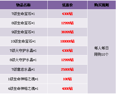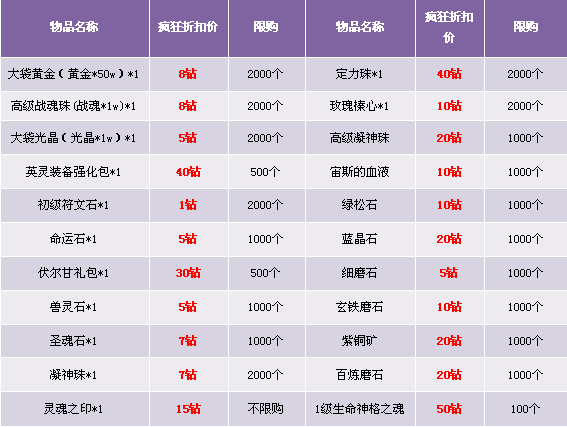 2. 限时热卖区域中的道具仅限“钻石”购买, 购买物品均为绑定;